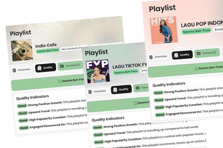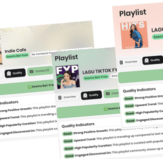 Our curators are constantly reviewed using tools trusted by Spotify, such as chartmetric, artist.tools, and isitagoodplaylist.